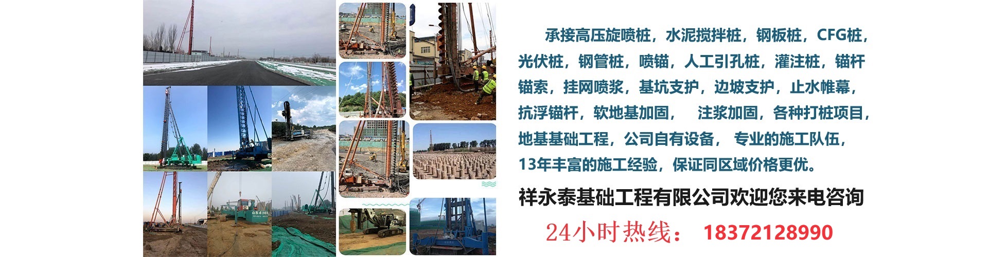祥永泰基礎(chǔ)工程有限公司是一家專業(yè)從事公路路基、路面、管道及橋頭等軟地基加固的公司;我公司主營(yíng)高壓旋噴樁施工,水泥攪拌樁施工,三軸攪拌樁施工,注漿加固,錨桿錨索施工,鋼板樁施工,鋼管樁施工,光伏樁施工,CFG樁施工,基坑支護(hù),鉆孔灌注樁,加勁樁,樁基施工,擁有一批經(jīng)驗(yàn)豐富的技術(shù)、施工人員和專業(yè)的成套壓漿設(shè)備。公司有專業(yè)施工技術(shù)人員10余人、施工人員70余人、壓漿成套設(shè)備30余套、施工車輛20余臺(tái),施工人員全部經(jīng)過(guò)專業(yè)的現(xiàn)場(chǎng)培訓(xùn),多人具有數(shù)十年的鉆孔、壓漿施工經(jīng)驗(yàn);所有機(jī)械設(shè)備、車輛安排專人定期保養(yǎng);保障了壓漿施工的安全、質(zhì)量及進(jìn)度。 公司以完善到位的專業(yè)化施工技術(shù)贏得了省內(nèi)外項(xiàng)目業(yè)主的信賴和好評(píng),公司在堅(jiān)持技術(shù)創(chuàng)新的基礎(chǔ)上,狠抓質(zhì)量管理,不斷提高服務(wù)水平,實(shí)現(xiàn)了公司業(yè)務(wù)的良性發(fā)展。